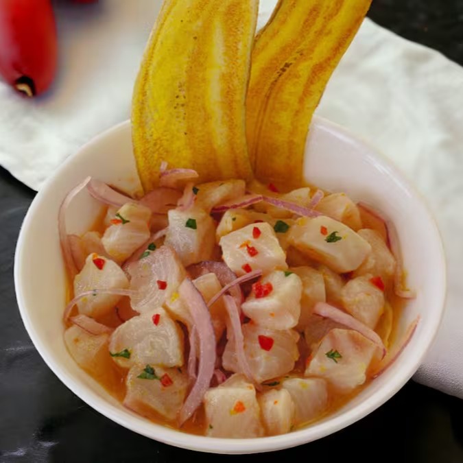 Cubos de tilápia fresca (180g de proteína), cebola roxa, coentro e pimenta dedo-de-moça, marinado no leite de tigre com limão, laranja e especiarias Rocoto. Chips de banana adicionam crocância.