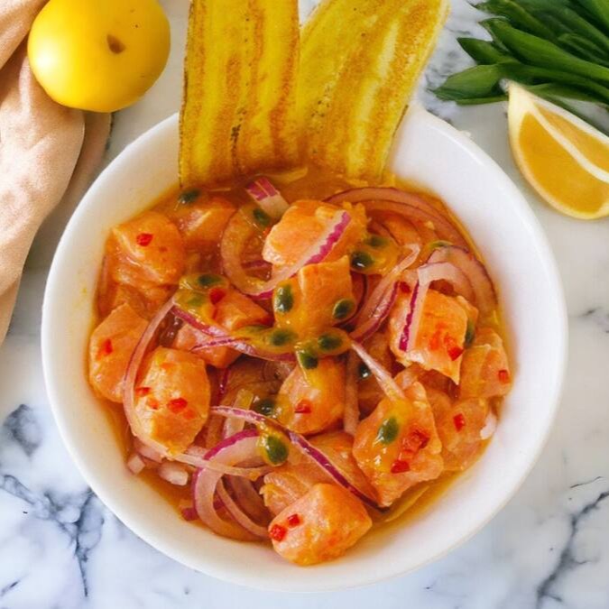 Salmão fresco em cubos, marinado no leite de tigre com limão, laranja e especiarias Rocoto, maracujá fresco, cebola roxa em fatias finas, pimenta dedo-de-moça e chips crocantes de banana. (800g)