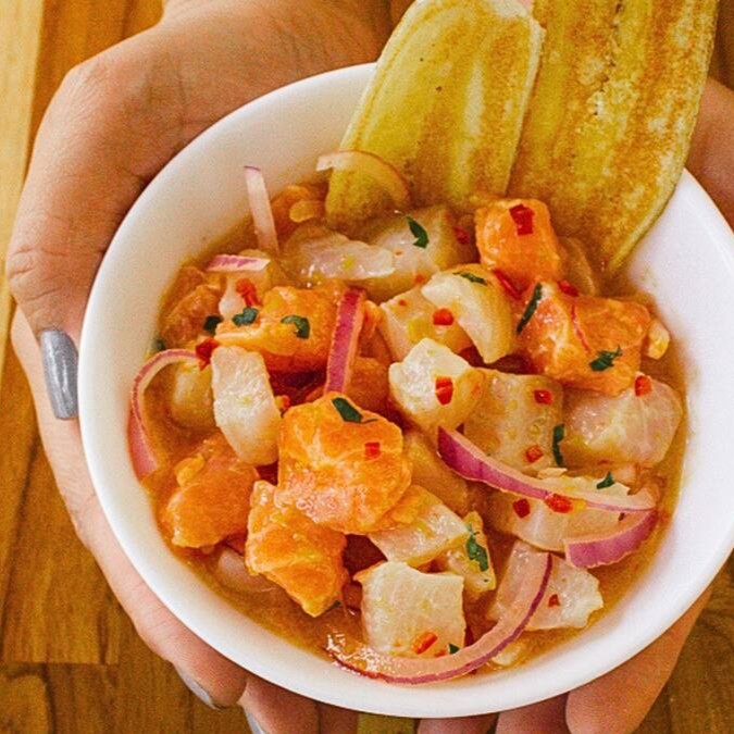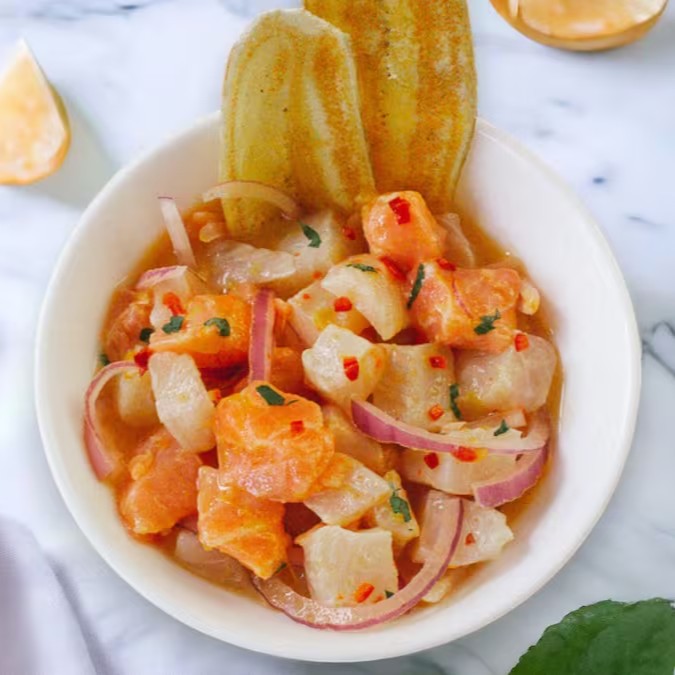 Ceviche Pero Que Sí Mix Tilápia C Salmão + Chips De Banana (porción)