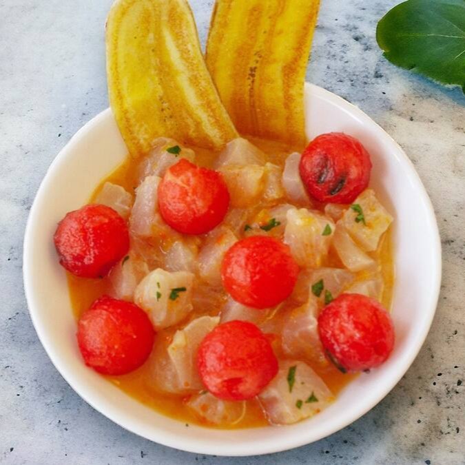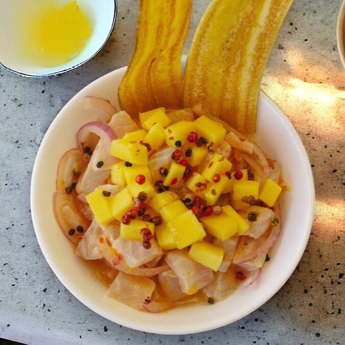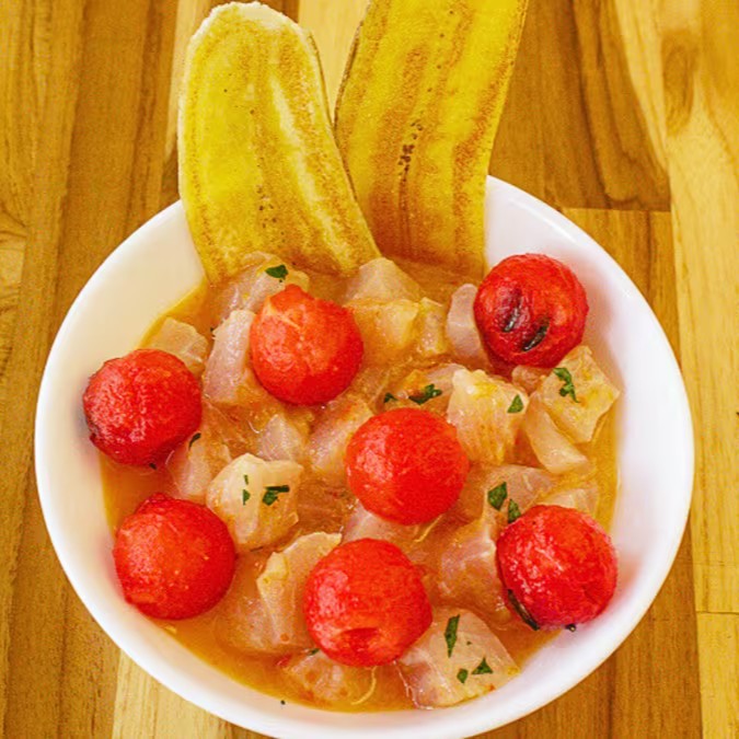Cubos de banana da terra com manga fresca, cebola roxa, pimenta rosa e chips crocantes de banana, banhados no leite de tigre com limão-taiti, laranja e especiarias Rocoto. Uma opção vegana, leve e refrescante.
