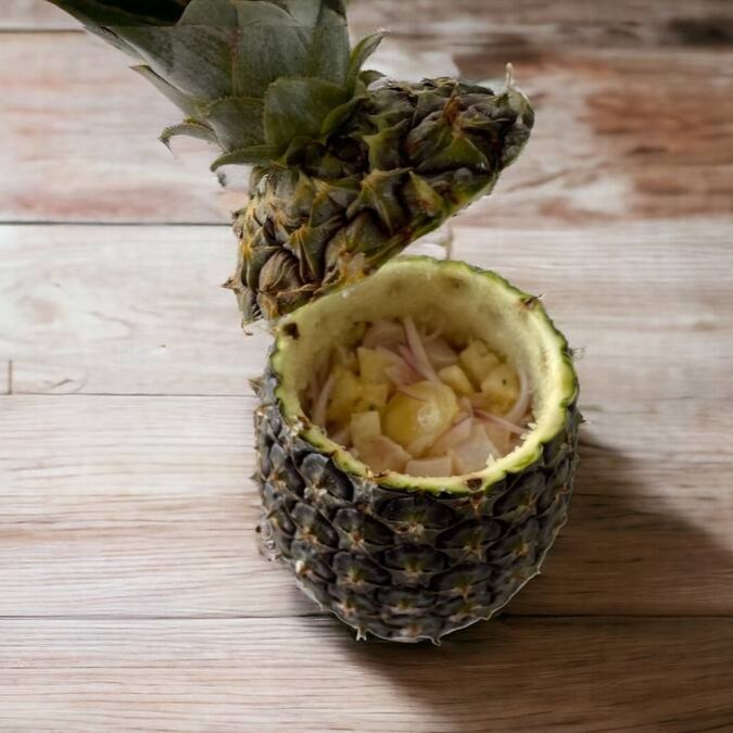 Tilápia fresca, abacaxi suculento, cebola roxa, leite de coco, hortelã e gengibre. Realçado pelo nosso Leite de Tigre com limão-taiti, laranja e mix secreto Rocoto. | Entregue no pote; imagem ilustrativa.