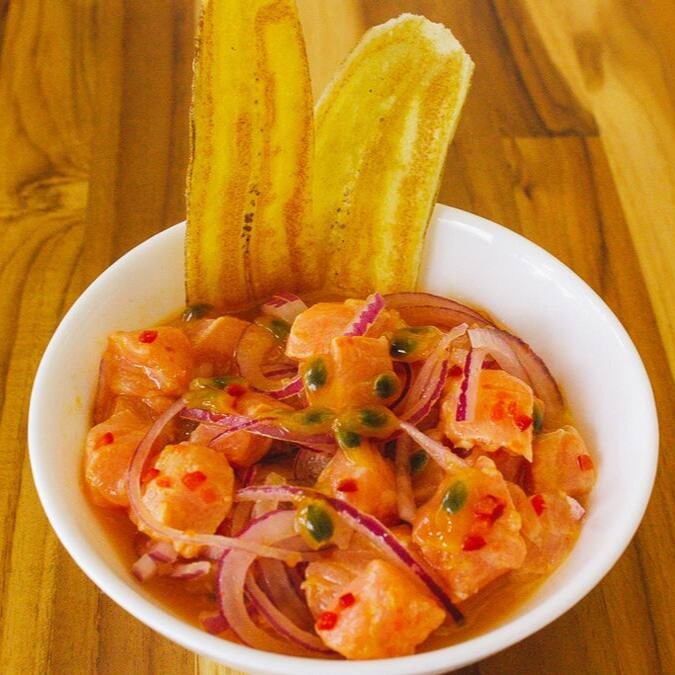 Salmão fresco (180g), cortado em cubos, marinado no leite de tigre com limão, laranja, especiarias Rocoto, maracujá, cebola roxa, pimenta dedo-de-moça e chips crocantes de banana. Um ceviche exótico e refrescante.