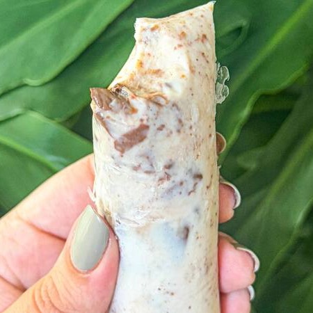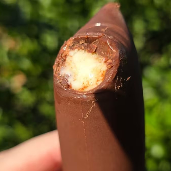 Geladinho cremoso com coco de verdade e com casquinha de chocolate.