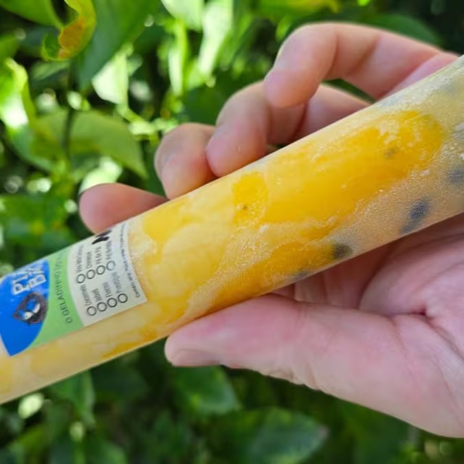 Geladinho cremoso de leite sabor mousse de maracujá, com geleia de maracujá de verdade!