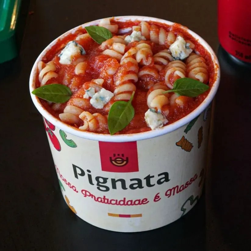 200g de massa italiana a sua escolha, molho napolitano, queijo gorgonzola e manjericão fresco.