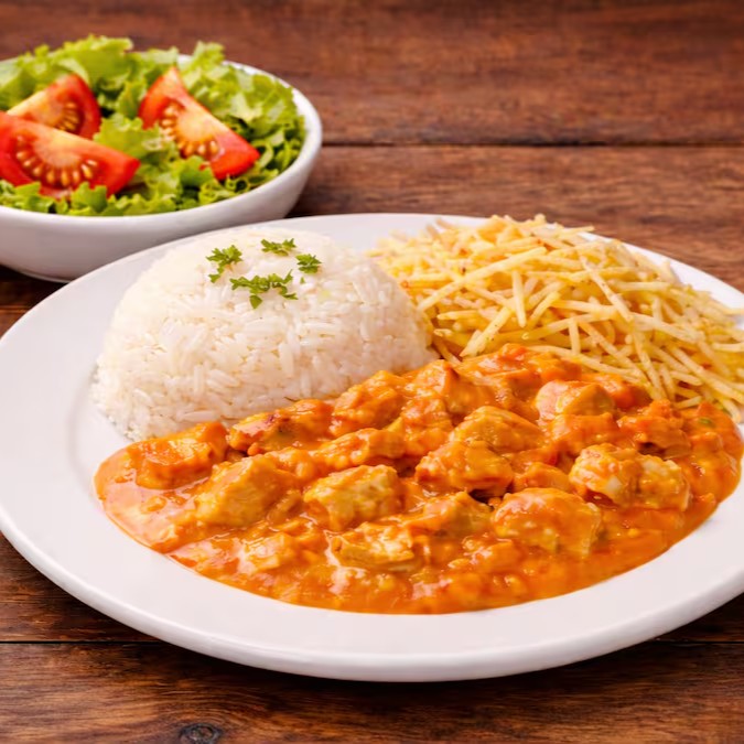 Delicioso Strogonoff de Frango, preparado com muito amor e capricho. Carne de primeira e temperos primorosos realçam o sabor desse prato clássico. Acompanha arroz, batata palha e salada