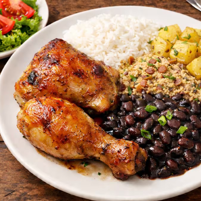Coxa e Sobrecoxa de frango assadas. Bem tenras e suculentas, com um tempero especial de ervas e especiarias. Acompanha arroz soltinho, deliciosas batatas souté, feijão preto encorpado, farofa e salada - Aprox. 500g