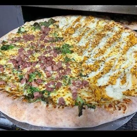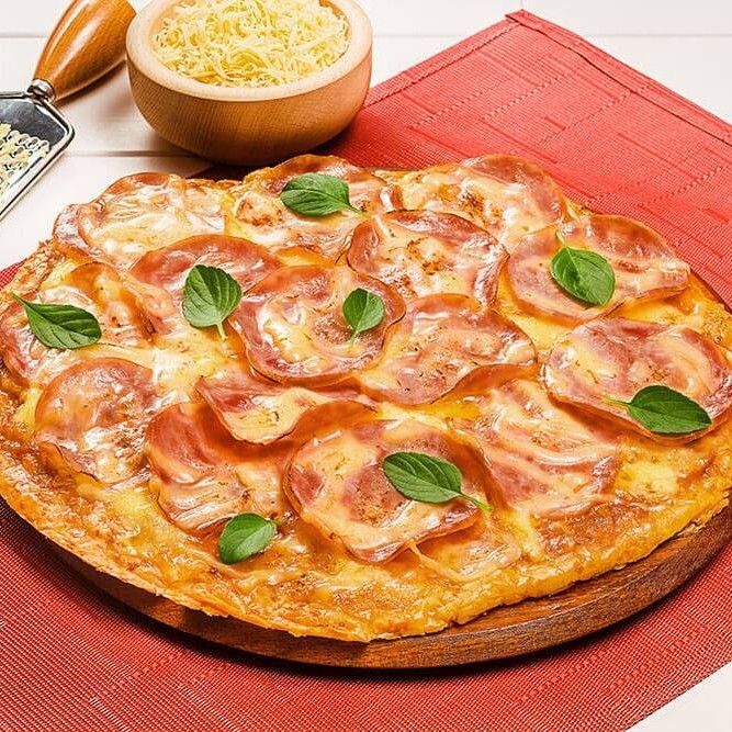 Muçarela, frango, calabresa, bacon e catupiry.