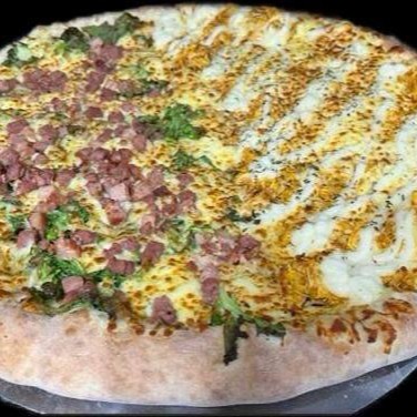 Muçarela, brócolis. Opções: alho ou bacon.