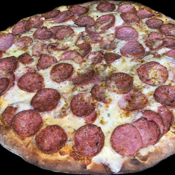 Muçarela e calabresa. Opções: cebola, catupiry ou cheddar.