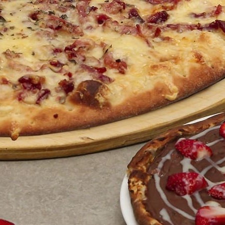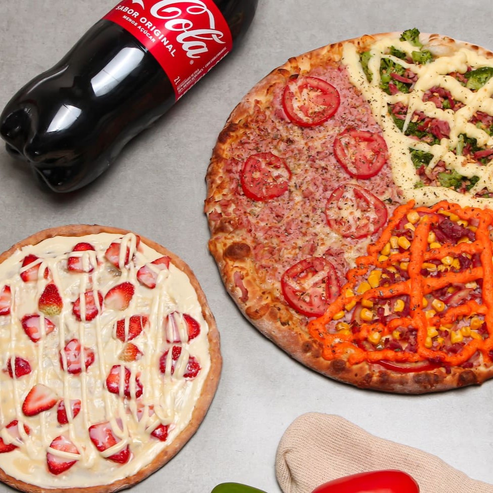 2 pizzas tradicional gigantes de 16 pedaços 1 pizza doce pequena 1 refrigerante (2 litros) Obs: Sabores de pizza especial, será cobrado + R$ 7,00.