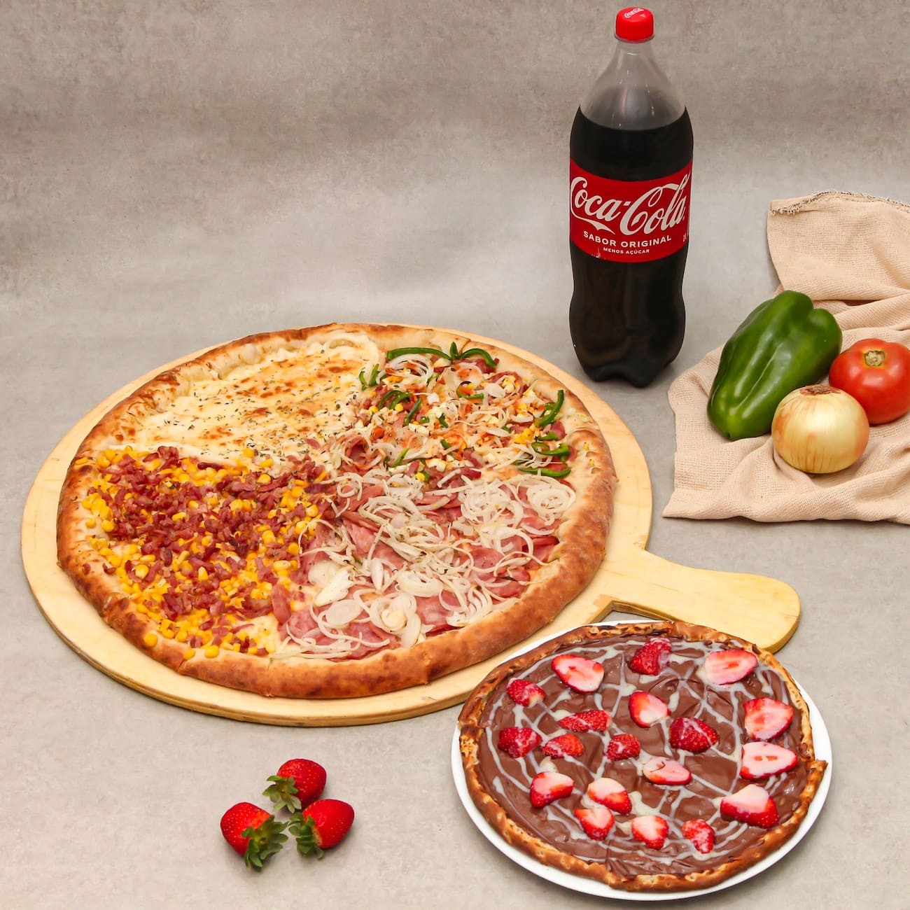 Uma pizza gigante 16 fatias mais pequena doce mais refri 2 litros
