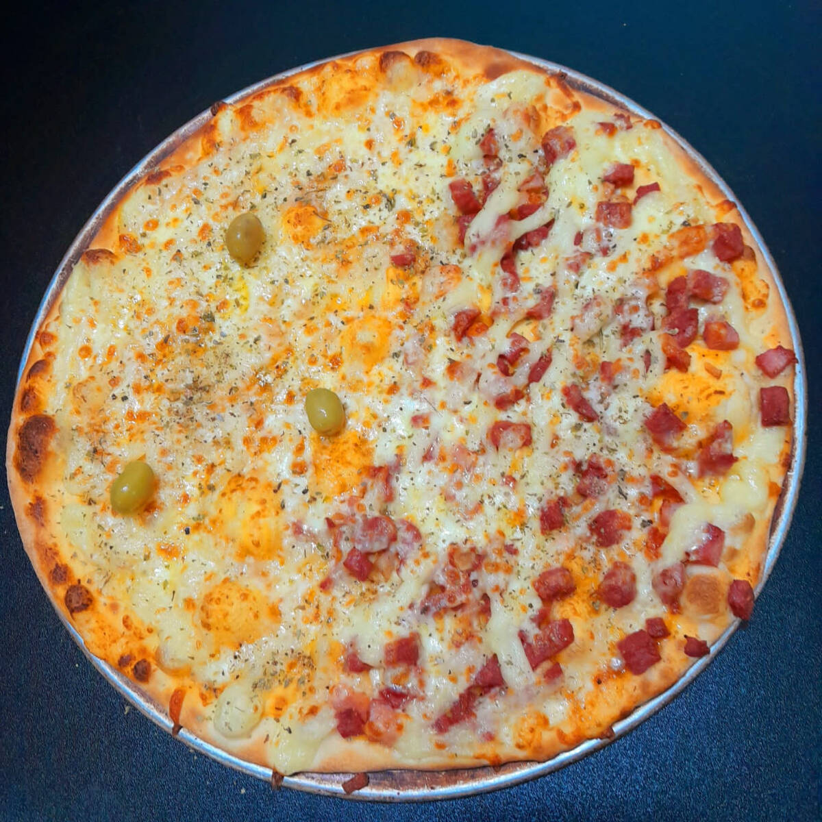Molho artesanal,mussarela,bacon,milho e oregano.