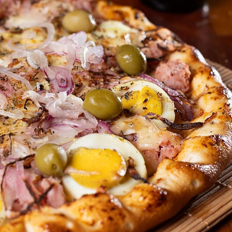 Molho Da Casa, Mussarela, Presunto Ralado, Ovos Fatiados, Champignon Fatiado E Orégano.