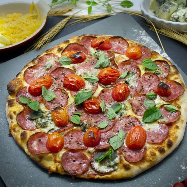 molho de tomate, mussarela, calabresa e orégano