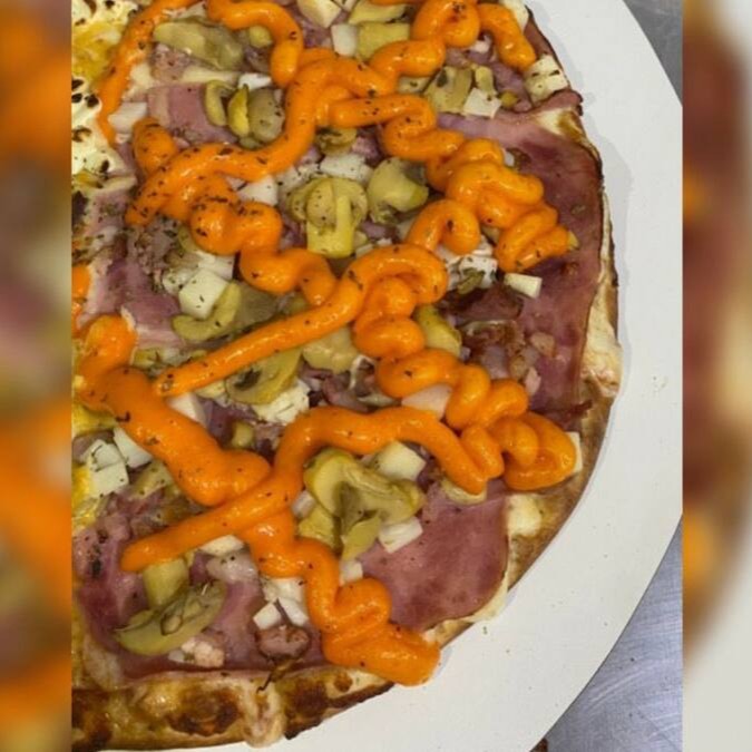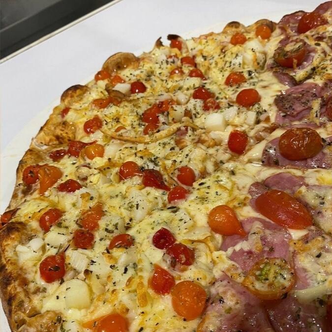 Mussarela, presunto, ovos, cebola, azeitona e orégano
