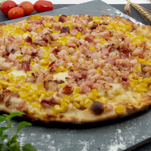 molho de tomate, milho, bacon em cubos e orégano