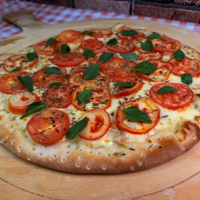 marguerita - base com molho de tomate, muçarela, tomate fatiado, manjericão e finalizado com oregano