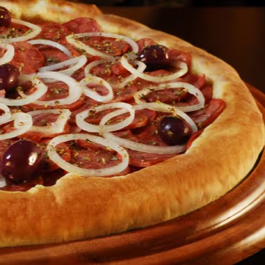 Molho, mussarela, calabresa, cebola, pimentão, pimenta e orégano.
