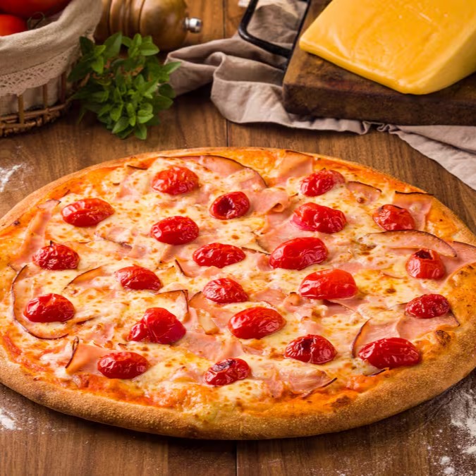 ingredientes: molho de tomate, mussarela e bacon em cubos.