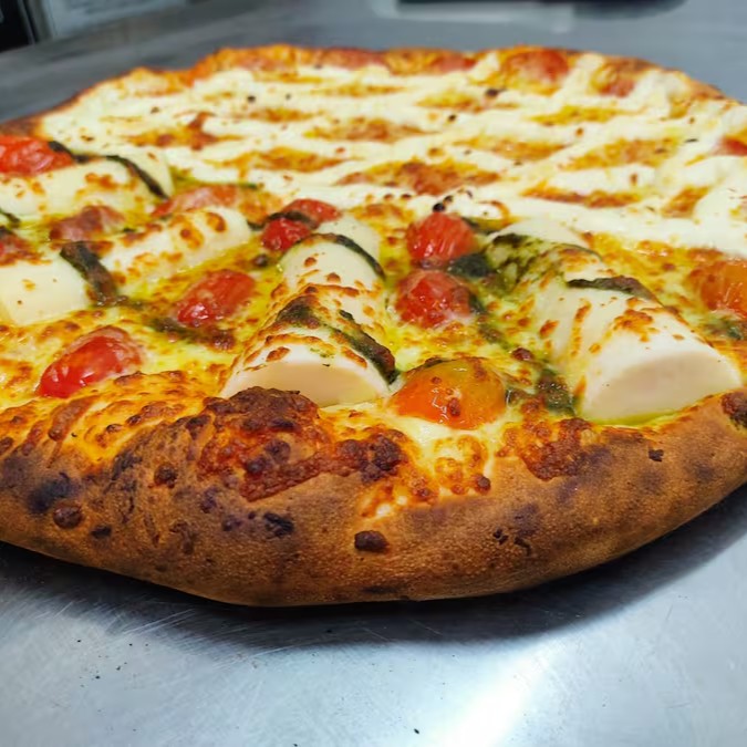 ingredientes: molho de tomate, mussarela, tomate e manjericão fresco.