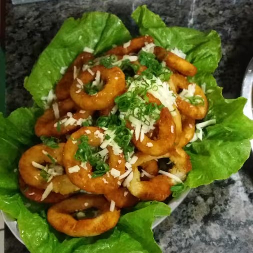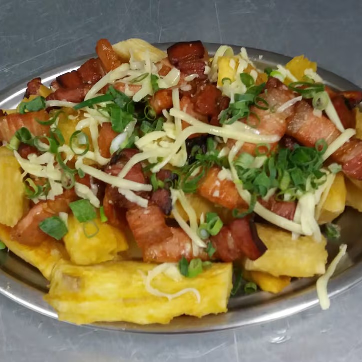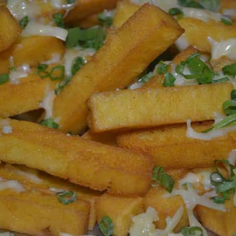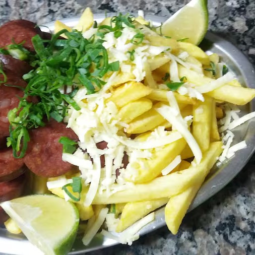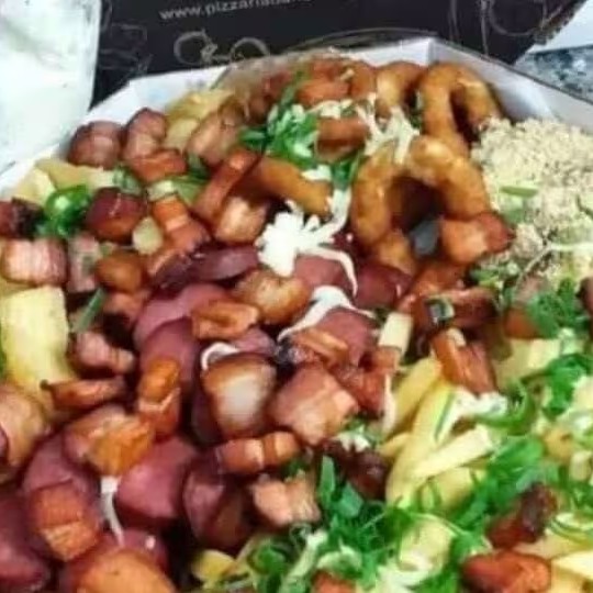 Anéis de Cebola, Batata, Calabresa, Aipim, Polenta. Por cima Bacon, Mussarela e Cheiro Verde. Acompanha molho verde e Farofa.