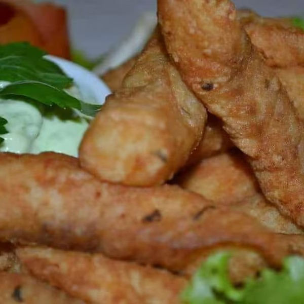 Anéis de cebola, queijo provolone e molho de ervas finas.