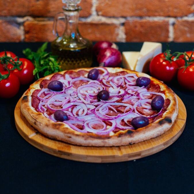 Massa com farinha italiana, longa fermentação, molho de tomate mussarela receita italiana, mozarela especial, fatias de linguiça calabresa, rodelas de cebola e azeitonas pretas.