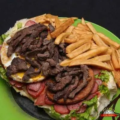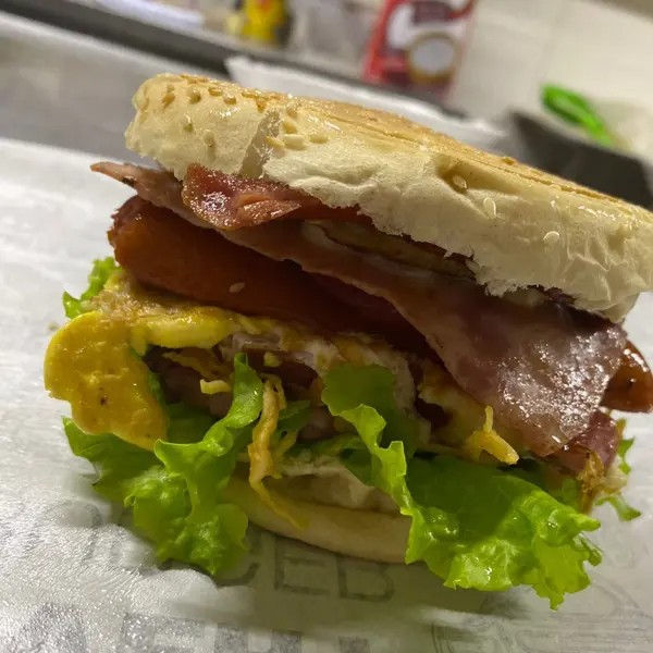 Pão de hambúrguer, maionese don roberto, alface, tomate, queijo, presunto, hambúrguer, calabresa, bacon, ovos e frango