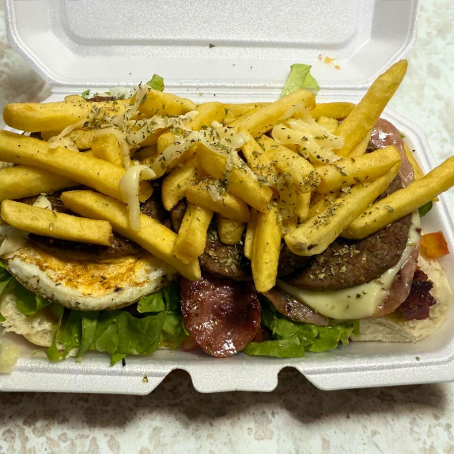 🥖 Pão fresquinho, maionese cremosa, 🌭 mostarda saborosa, 🍅 ketchup suculento, 🥬 alface crocante, 🍅 tomate suculento, 🥓 presunto saboroso, 🧀 queijo derretido, 🍳 ovo dourado, 🥓 bacon crocante, 🌭 calabresa, 🍔🍔🍔 1 hambúrguer suculentos e 🍟 200g de fritas douradas.