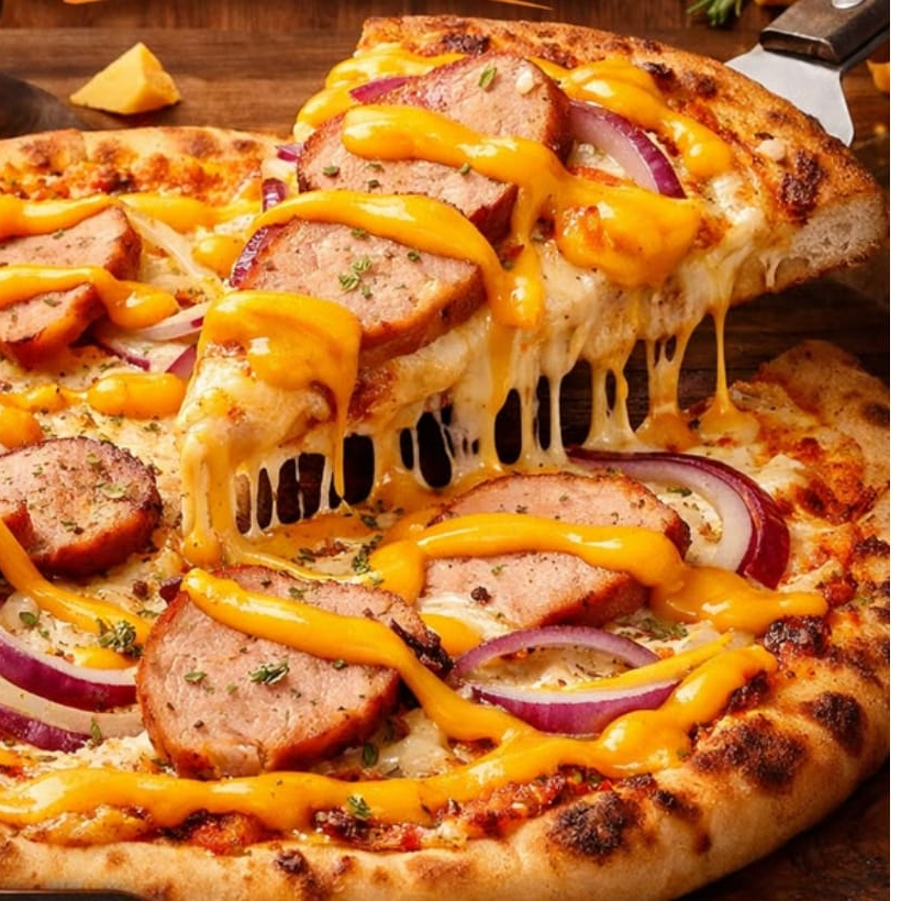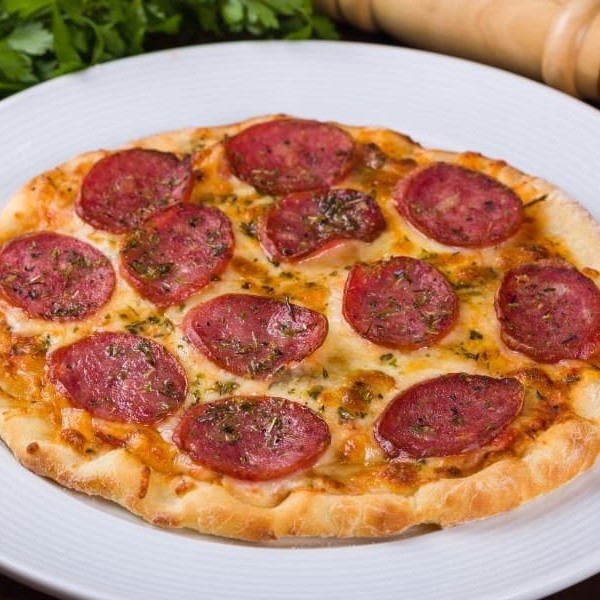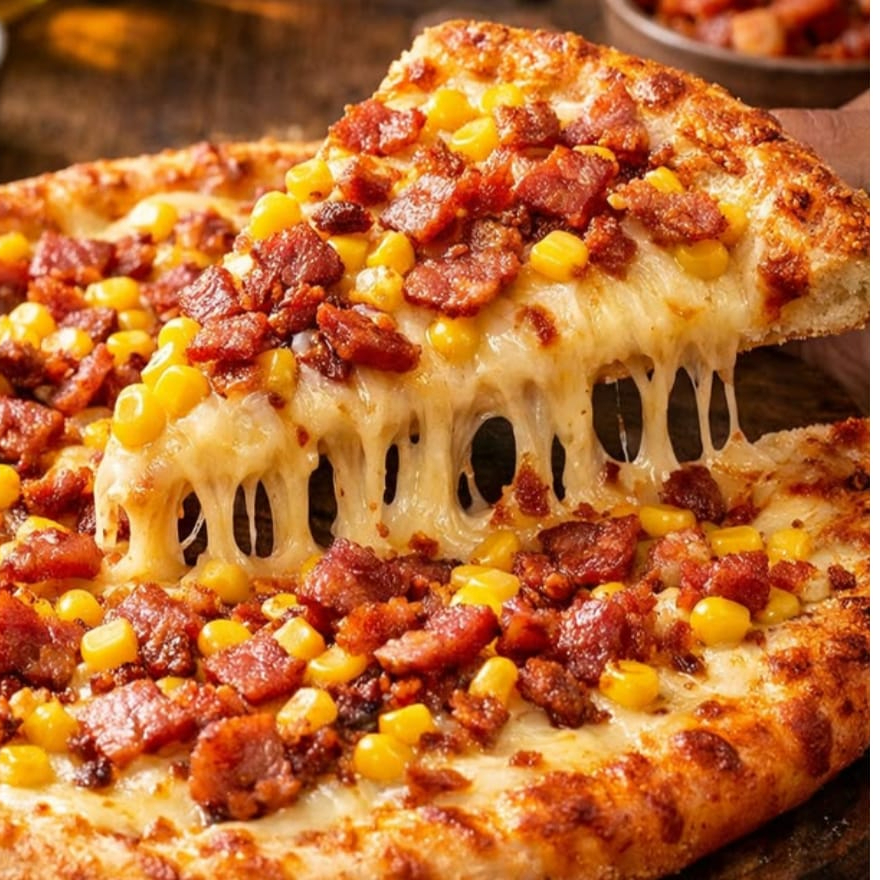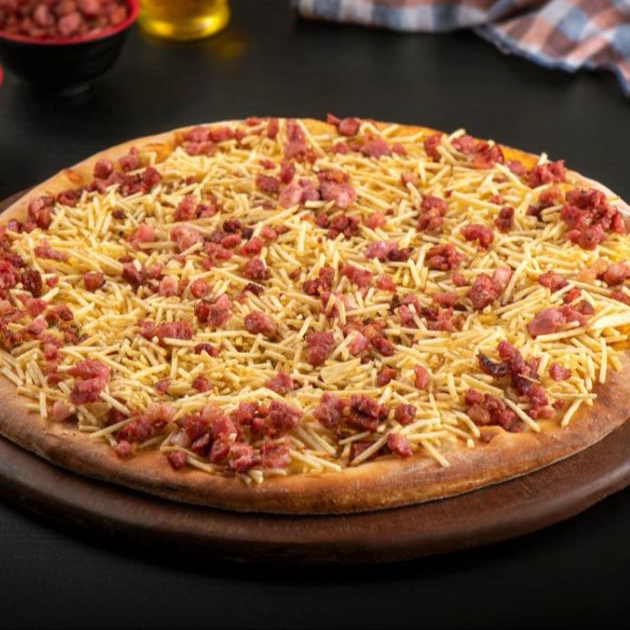 Mussarela, calabresa, bacon, milho, catupiry e orégano.