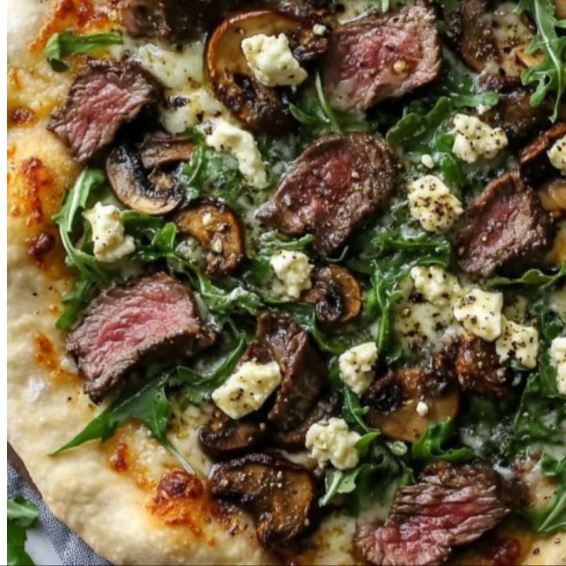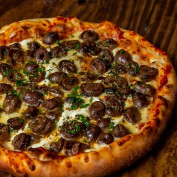 Mussarela, molho especial da casa, mignon em tiras ao molho madeira, champignon e orégano.