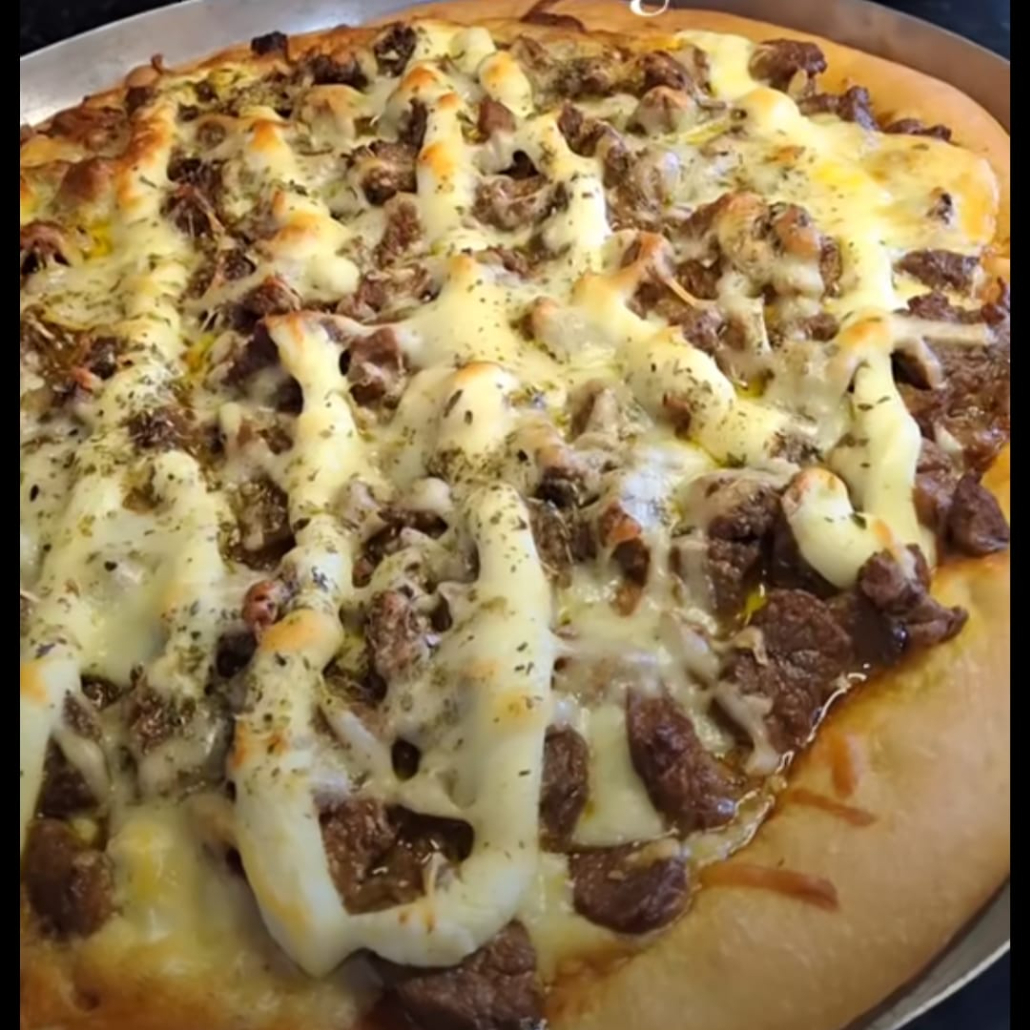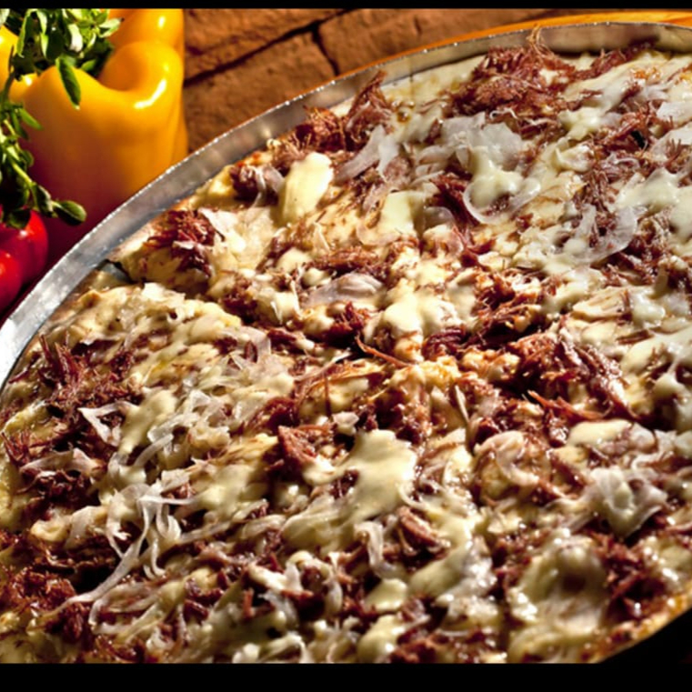 Mussarela, molho especial da casa, picanha e orégano.