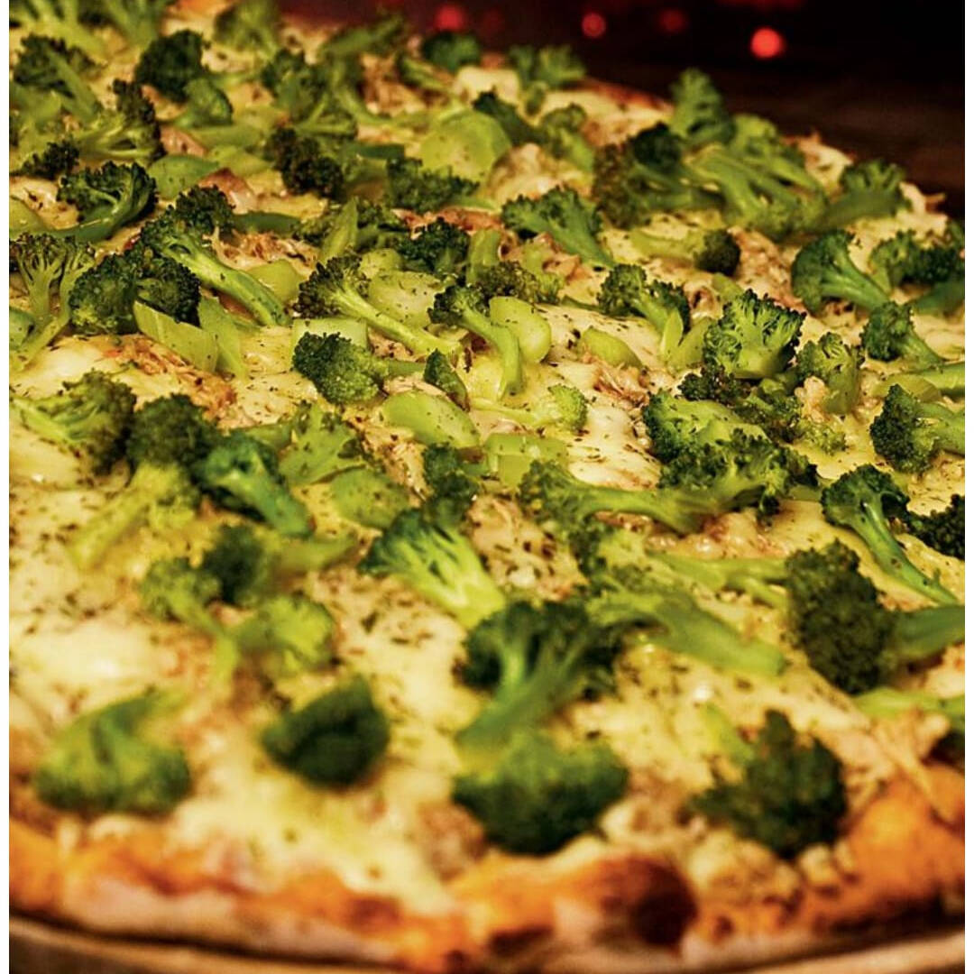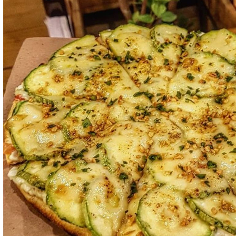 Molho especial da casa, mussarela, abobrinha, bacon, cream cheese, cheiro-verde e orégano.