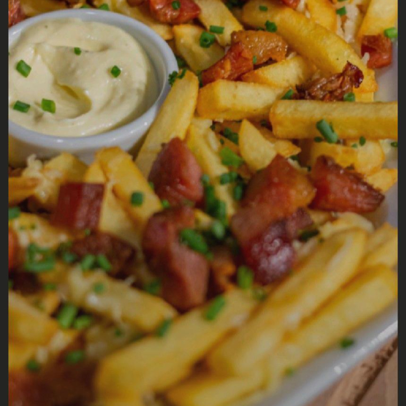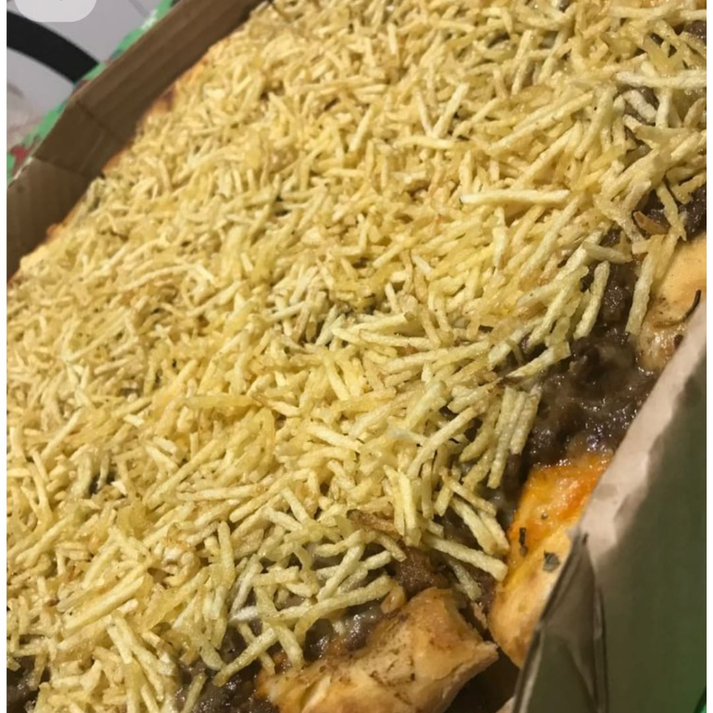 Molho especial da casa, mussarela, batata palha, bacon e orégano.