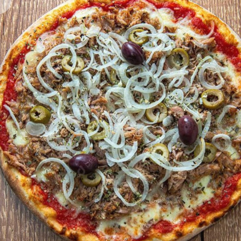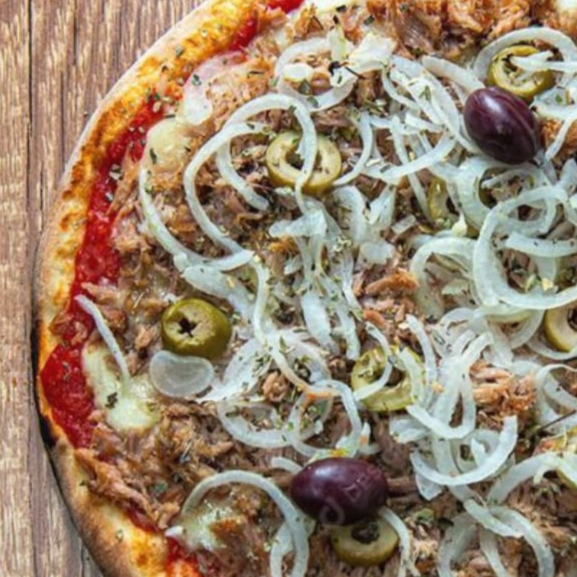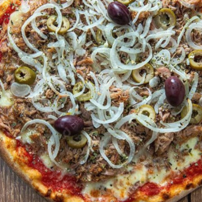 Molho especial da casa, mussarela, atum, azeitona e orégano.