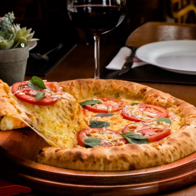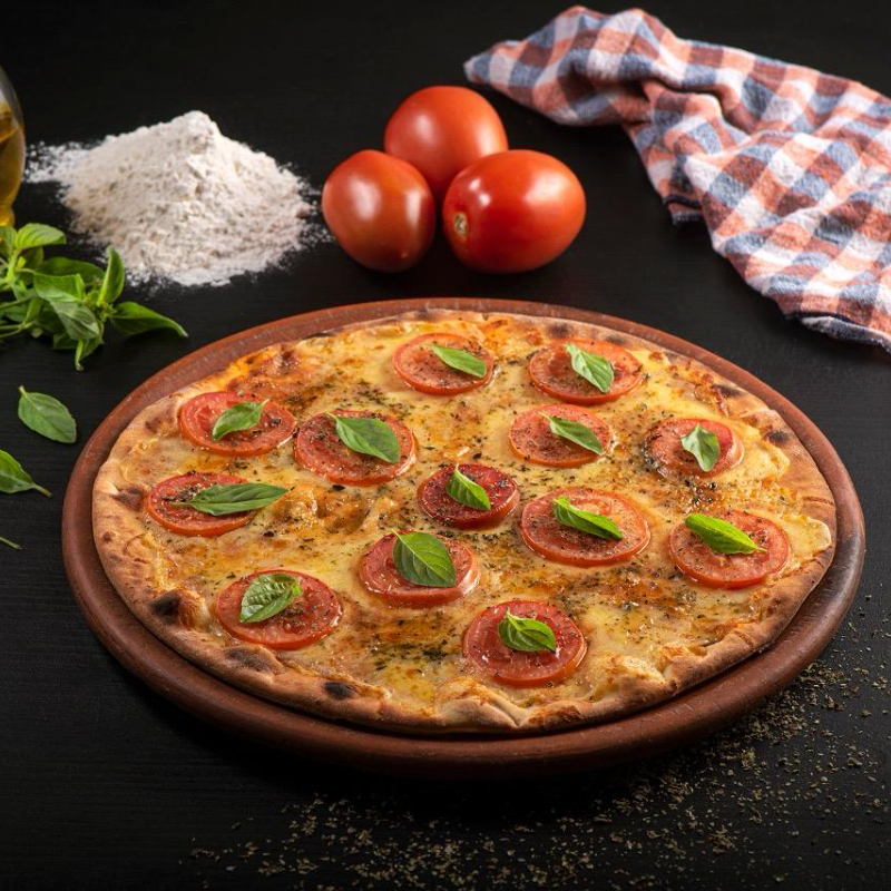 Molho especial da casa, mussarela, tomate, manjericão e orégano.