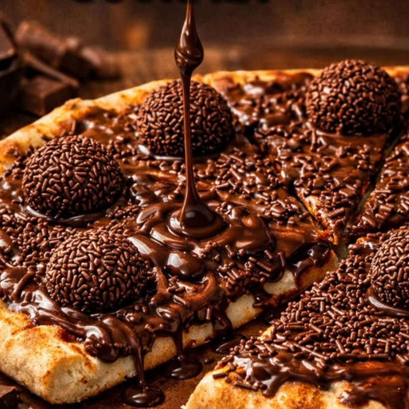 Mussarela, chocolate preto, granulado e leite condensado.