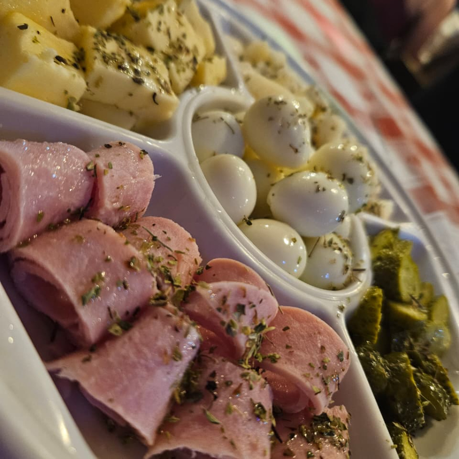 Mussarela, molho especial da casa, alcatra na brasa, vinagrete e orégano.