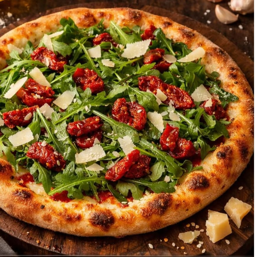 Molho especial da casa, mussarela, rúcula, tomate seco e orégano.