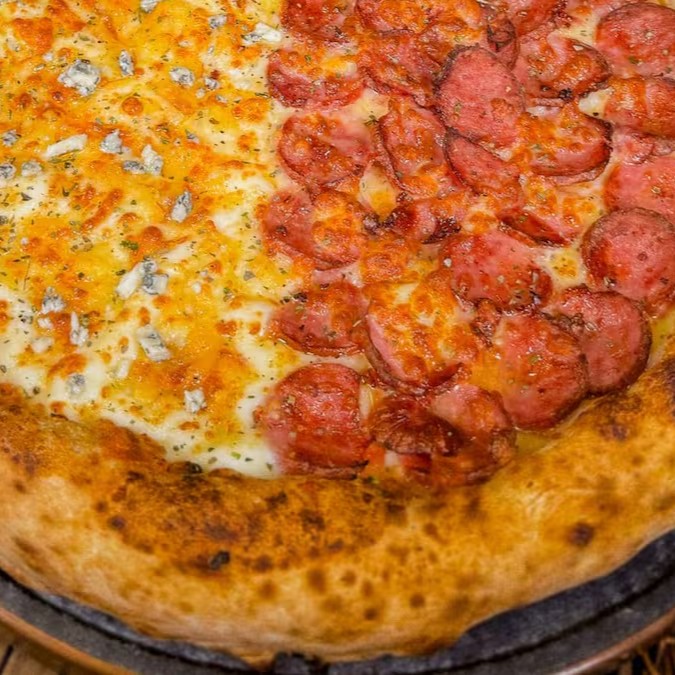 Meia 4 Queijos, meia calabresa. Gorgonzola intenso, parmesão e Catupiry cremoso sobre mussarela derretida e molho especial, finalizada com orégano. Uma pizza rica, cremosa e cheia de sabor, com fatias suculentas e cebola dourada e mussarela derretida sobre uma massa crocante
