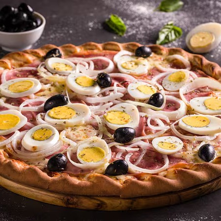Presunto e ovos fatiados com cebola dourada e azeitonas sobre mussarela derretida e molho especial, finalizada com orégano. Um clássico cheio de sabor e cremosidade!