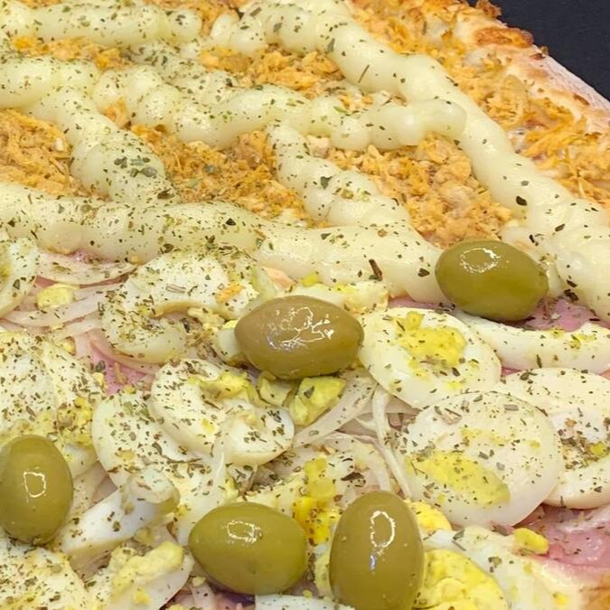Mussarela, 0vos, palmito, cebola, ervilha e azeitonas.