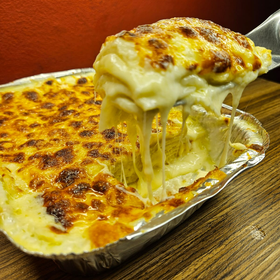 Massa de lasanha artesanal, mussarela, provolone, catupiry e parmesão. Assada no forno á lenha.