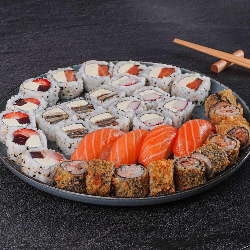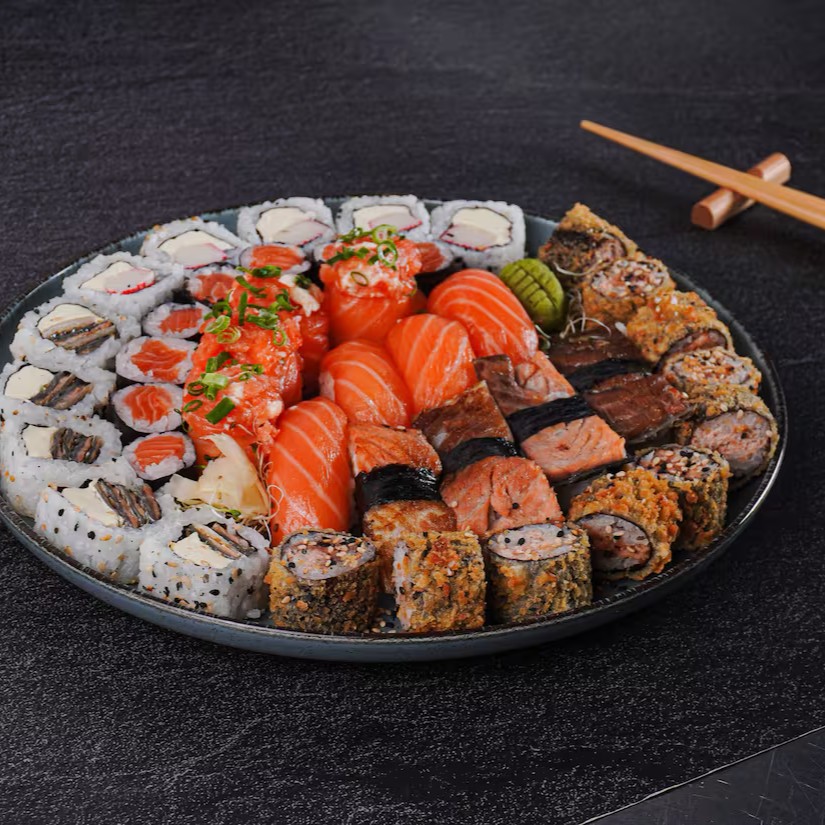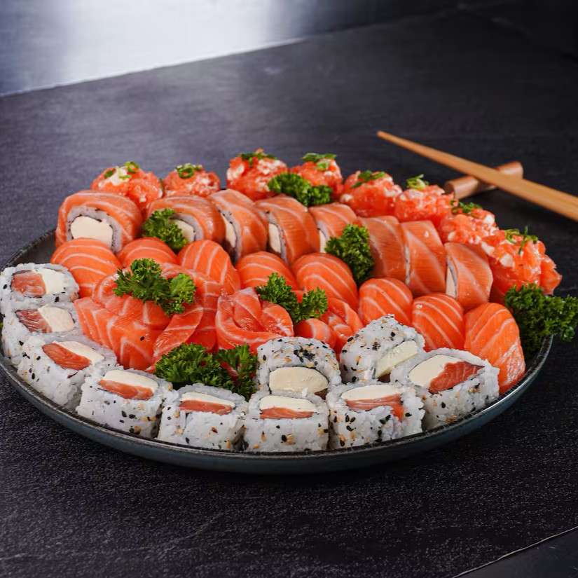 Delícia garantida com 10 sashimi de salmão, 10 uramaki filadelfia, 10 uramaki Filadelfia especial, 8 hossomaki de salmão, 8 niguiri de salmão e 8 joe de salmão.