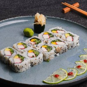 Cubos de salmão (100gr), cream cheese, sunomono, tomate cereja e manga. Delicioso arroz shari (130gr) e finalizado com gergelim salpicado, cebolinha e um toque de molho de ostra.