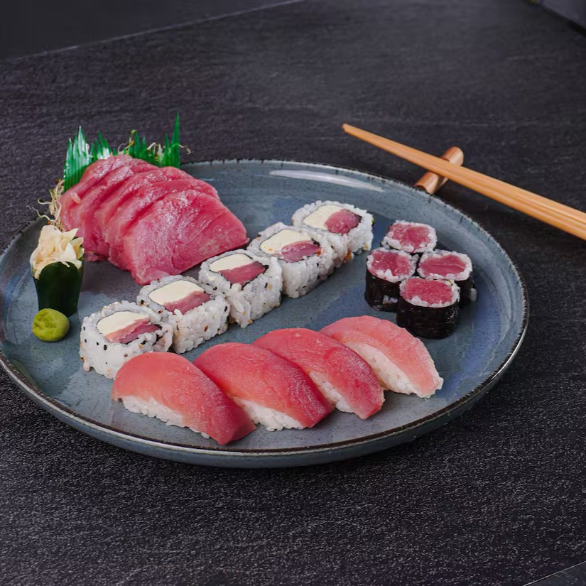 Combinado especial: 5 sashimi de atum, 5 uramaki atum, 4 niguiri de atum, 4 teka maki de atum.