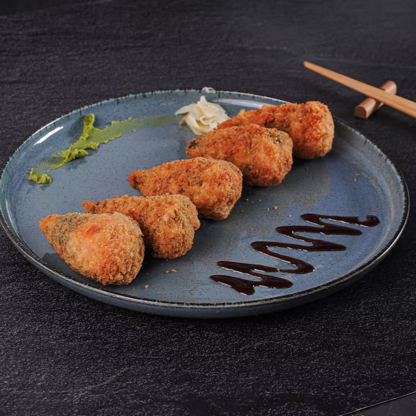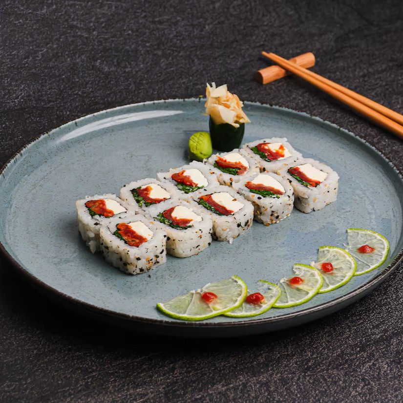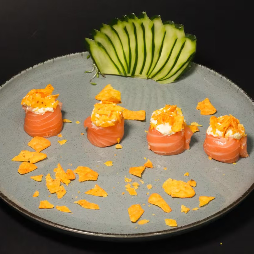 Sushis enrolados e quentinhos, recheados com salmão e cream cheese. Finalizados com cream cheese cremoso e couve crocante por cima.