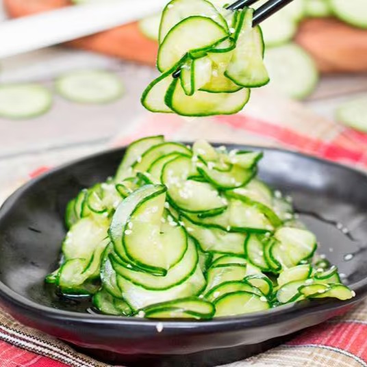 Rodelas de pepino extremamente finas, marinadas em molho agridoce e finalizada com gergelim.