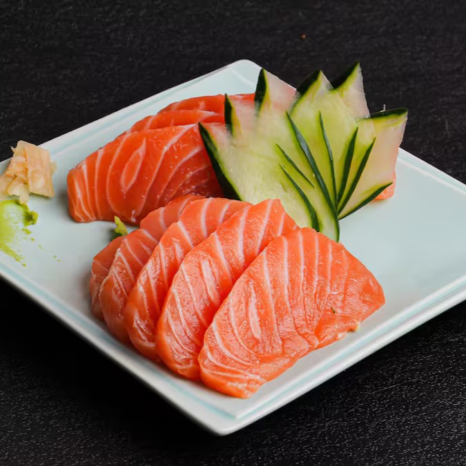 Combinado Japa: 10 sashimis de salmão, 4 uramaki filadelfia, 4 niguiri de salmão e 4 joe de salmão. Todos acompanham gengibre e wasabi para realçar o sabor.